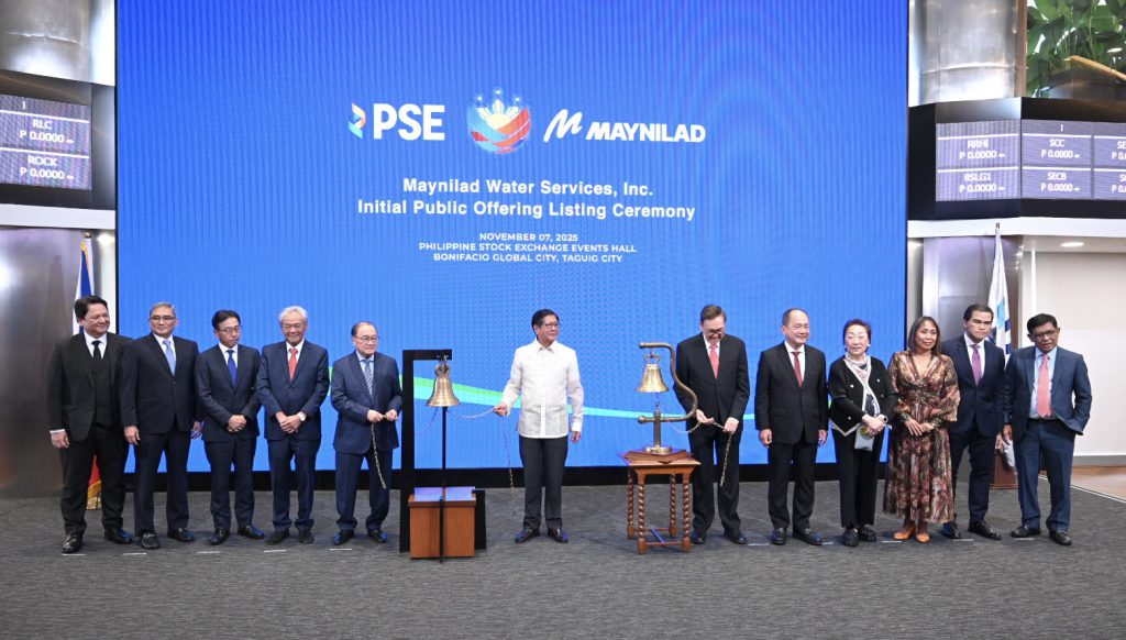 President Ferdinand R. Marcos Jr. joined Maynilad Water Services, Inc. and Philippine Stock Exchange (PSE) officials in ringing the bell to mark Maynilad’s official listing on the PSE on November 7, 2025, held at the PSE Events Hall in Bonifacio Global City, Taguig.